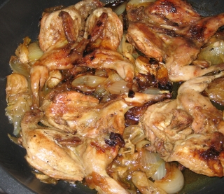 Casi a continuación añadimos las cebollas cortada (tipo barco), y lo dejamos que se vaya haciendo a fuego lento, removiendo y girando las codornices de vez en cuando.